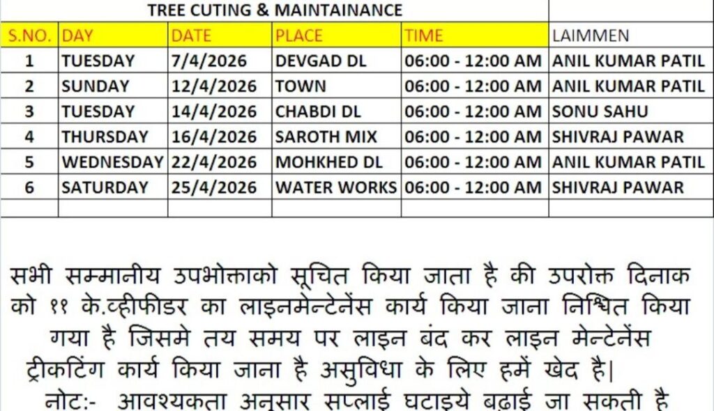 इस काम में अनिल कुमार पाटिल, सोनू साहू और शिवराज पवार सहित विभाग के कर्मचारी शामिल रहेंगे। वे तय जगहों पर जाकर लाइन की जांच, मरम्मत और पेड़ों की छंटाई करेंगे, ताकि आगे चलकर बिजली से जुड़ी परेशानियां कम हो सकें।